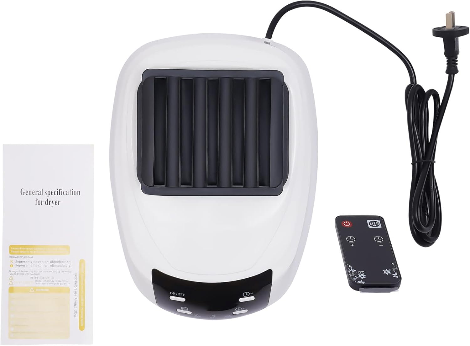 SpecificationHeating Method: PTC 5-layer HeatingTiming Range: 0-240 minPlug: US StandardVoltage: 110vThree Gears Adjustment: Cold Air Gear / Low Heat Gear / High Heat GearBracket Material: Thickened Stainless SteelHost Material: High-Temperature Resistant PCFabric Cover Material: High-density Waterproof Oxford ClothNumber of Support layers: 2Working Temperature: 60-70℃Load Weight: 30kg/66.14lbsPower: 1200-1500WWorking Noise: <45 dBPower Failure Protection: Safety Temperature ControlNet Weight: 3.85kg/8.49lbs Gross Weight: 4.4kg/9.7lbsProduct Size: 70*50*150cm/27.55in*19.68in*4.92ft Package Size: 71*23*23cm/ 27.95*9.06*9.06inPackage Included1* Folding Re-mote Control Dryer27 * Tubes 4 * Wheels1* Re-mote Control1* Outer Cover1* English Instruction ManualAll Accessories for InstallationNotesPlease allow the slight color difference caused by the shooting light and 1-3 cm error due to manual measurement, and make sure you do not mind before ordering.