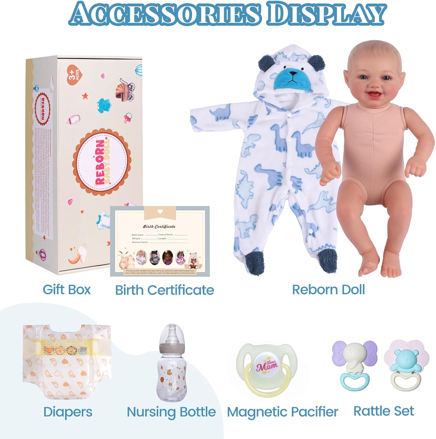 | Included Components | 1 x Baby doll, 1 x Nursing bottle, 1 x Magnetic pacifier, 1 x Birth card, 1 x Clothes set ,1 x Gift box, 1 x Diapers, 2 x Rattle set |