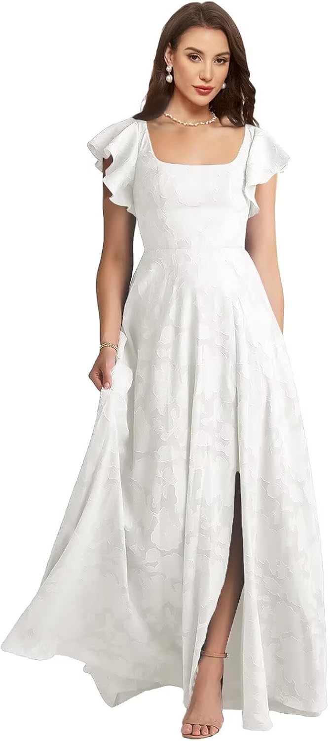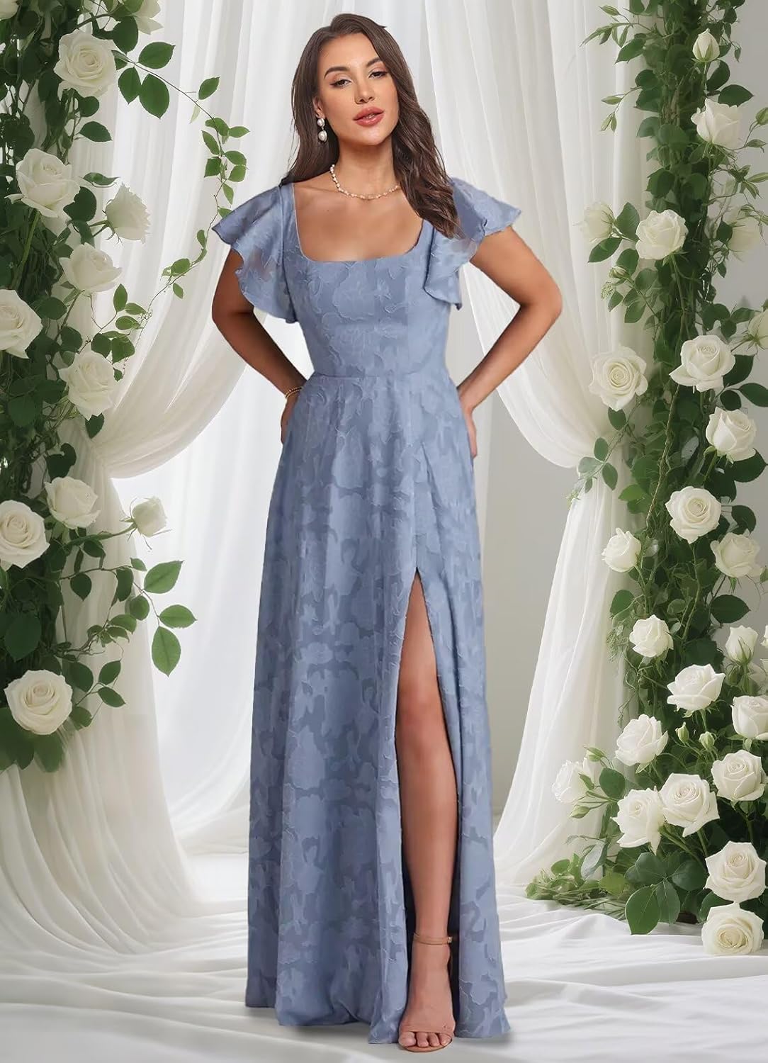 Women's floral long pleated chiffon bridesmaid dresses with slit,short flutter sleeves prom evening dress for women,zipper back.This square neck maid of honor gowns is elegant and charming,and wearing it will make you pretty Closure:Zipper BackLength:Long