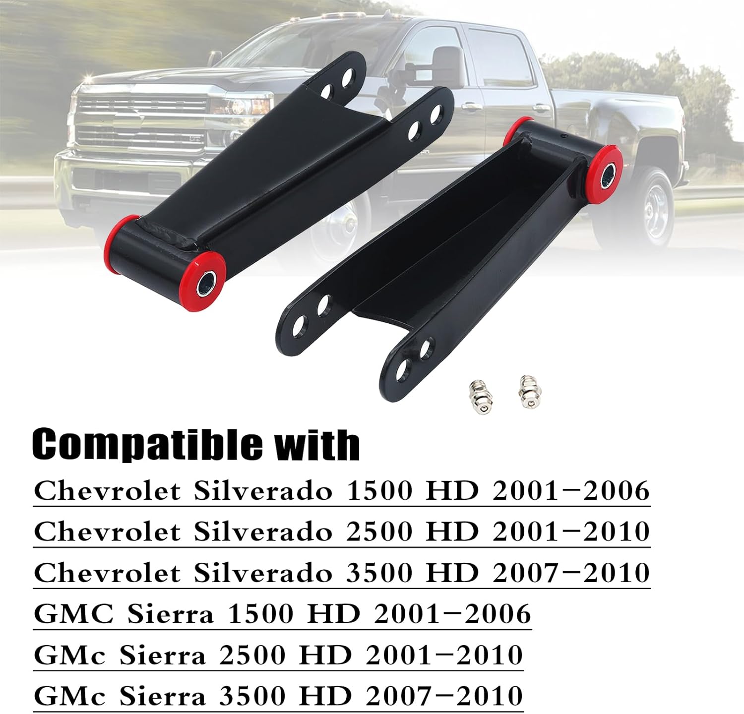 ?About us:;This TUNTUN Rear Drop Lowering Shackles;set;was manufacturer by a professional factory in China, which have been specialized in;automobile parts;for many year. All products have been exported to Global Market which was made of High Quality Material,ensuring a long service life. Factory direct, quality assurance, best price! ?OEM Part Number:;410730 ?Fits for:; Fit For 20012006 Chevrolet Silverado 1500HD ; 20012006 GMC Sierra 1500HD. Fit For 20012010 Chevrolet Silverado 2500HD; 20012010 GMC Sierra 2500HD. Fit For 20072010 Chevrolet Silverado 3500HD; 20072010 GMC Sierra 3500HD. ?Function: The adjustable design can lower your truck 23 inches smoothly, providing you with longterm stability and excellent performance. ?Features:;Easy installation; Direct replacement and Perfect fit; Our Rear Drop Lowering Shackles is a perfect replacement, made of high quality antirust steel material which is is strong and durable in avoid of rust and corrosion, ensuring high performance to extend long service life. ?Our :;One year . All products have been 100Percent tested before delivery and to offer true worryfree shopping experience. Wishing you a happy online shopping! :);