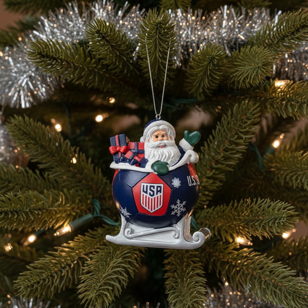 USA Men’s Soccer Soccer Ball Sleigh Ornament – Official USMNT 2026 FIFA WORLD CUP Novelty Holiday Decor with Team Logo – Fun & Collectable Team USA Winter Decoration for Parties, Displays, and Trees – Licensed Fan GearSanta’s on his way, and he’s filled his sleigh with National Team pride! Keep the hype for the men of Team USA kicking through both the offseason and the holiday season with the USA Men’s Soccer Soccer Ball Sleigh Ornament by Forever Collectible. With a sleigh full of presents and iconic logo against the red and blue of your favorite team, there will be no questioning who you root for, even in the Yuletide season!Whether you’re decking the halls, wrapping gifts, or watching replays of your favorite matches with nostalgia, this licensed decorative ornament will help infuse your team spirit with your holiday spirit this winter. Hang it from the tree and relive exciting memories from seasons past, position it on the dinner table to rekindle passionate discussions with rivals, or place it next to Christmas cards for an extra bit of flair. Makes an excellent white elephant gift, dorm room decoration for the big kids at college, or stocking stuffer for kids, parents, and grandparents.
